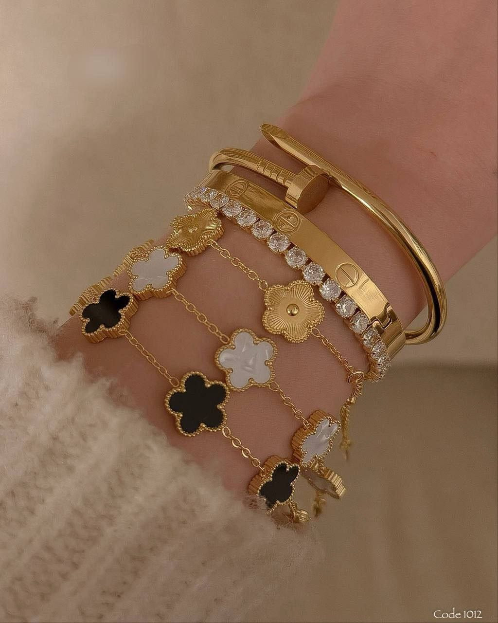 The Perfect Stack: This set features a mix of Mother of Pearl style clovers, a sleek Nail Bangle, a classic Screw-Motif Bangle, and a sparkling Tennis Bracelet.